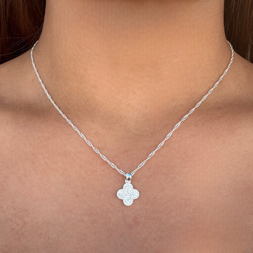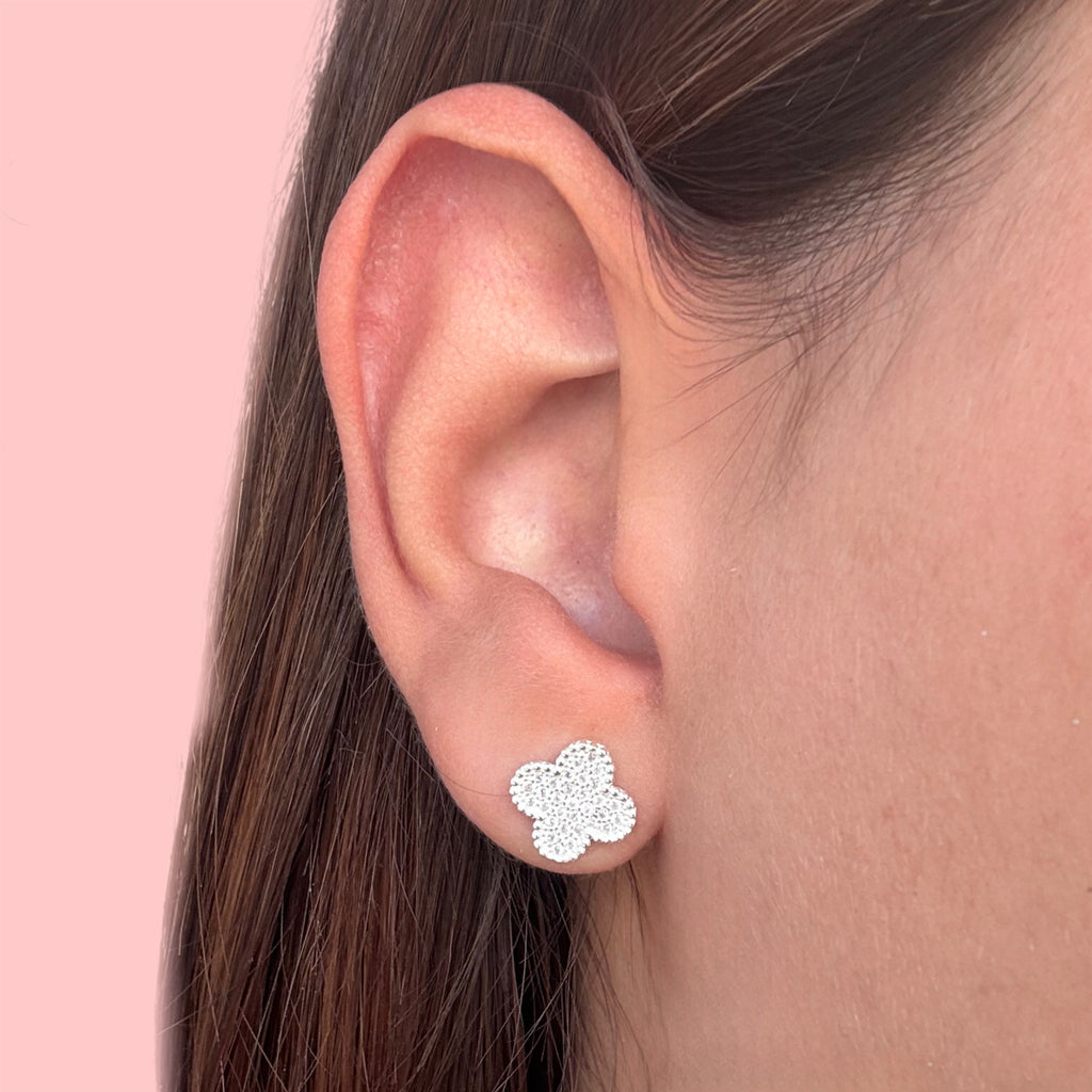 Delicate, modern, and full of charm! This 925 sterling silver set features a classic four-leaf clover fully adorned with sparkling micro zirconias. A perfect piece for those who love minimalist jewelry with a touch of luck and elegance.