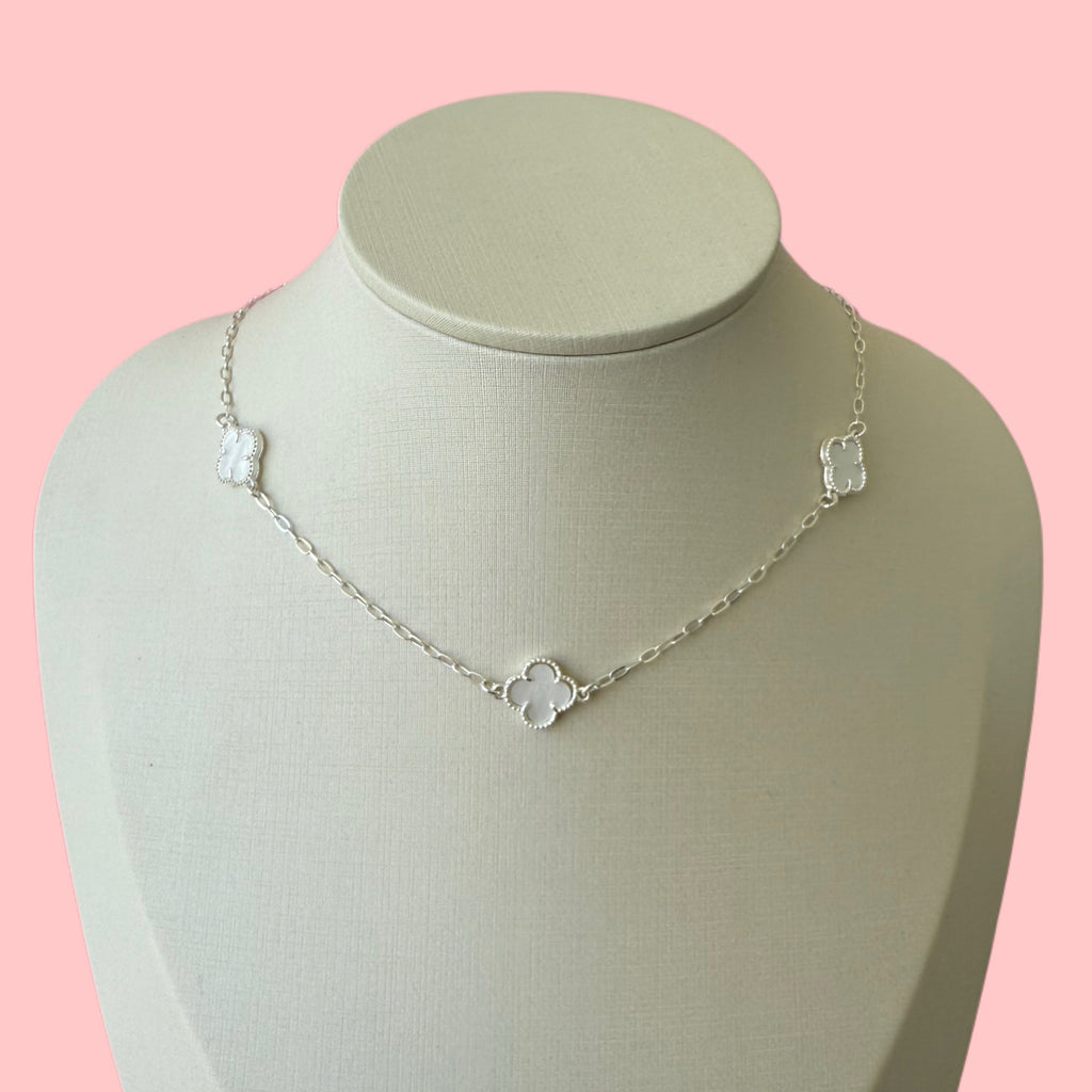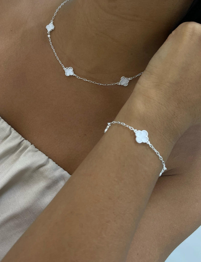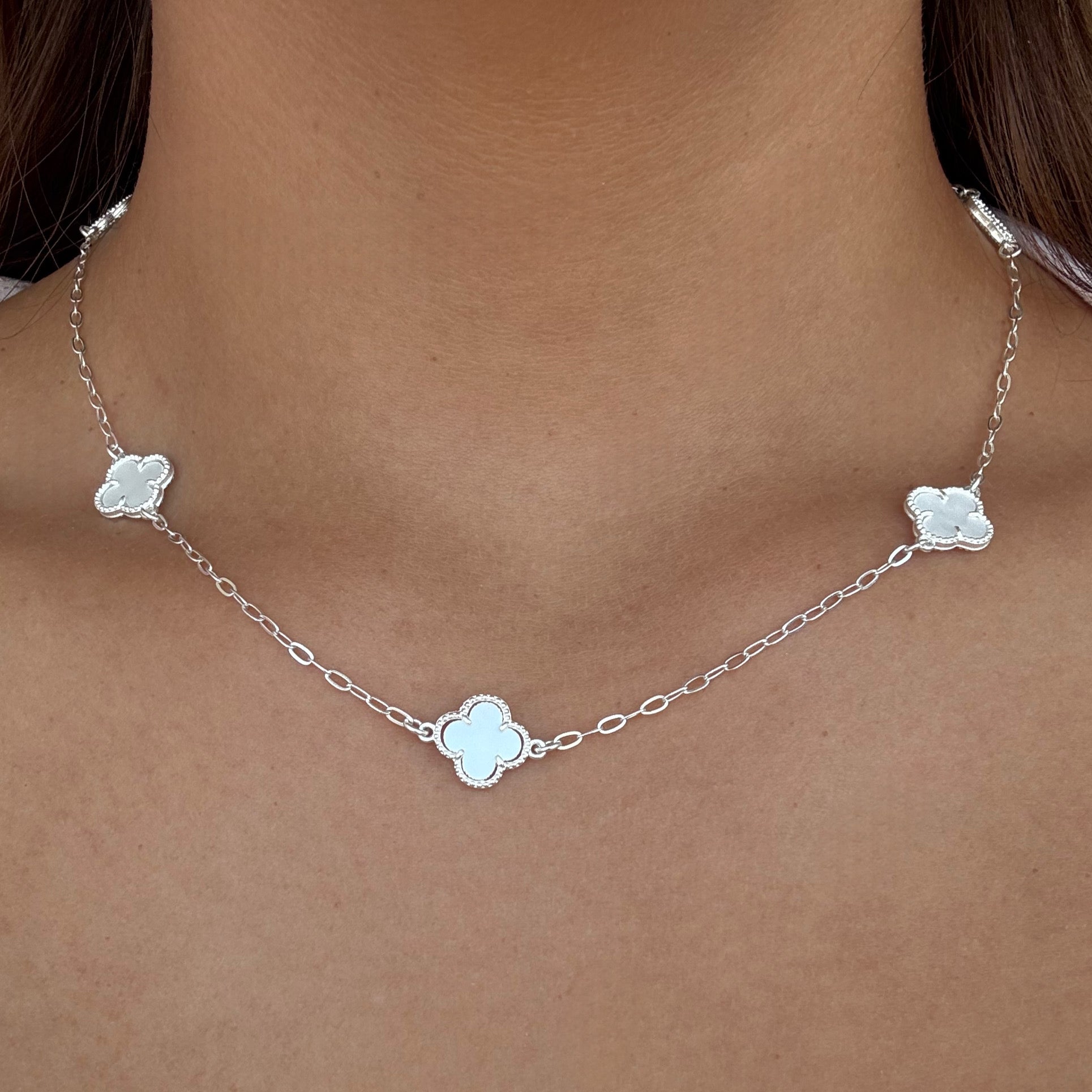 Delicate and radiant ✨ This beautiful necklace features four clover-shaped charms made of mother of pearl, crafted in solid 925 sterling silver. Adjustable to fit closer to the neck — perfect for layering or wearing solo.