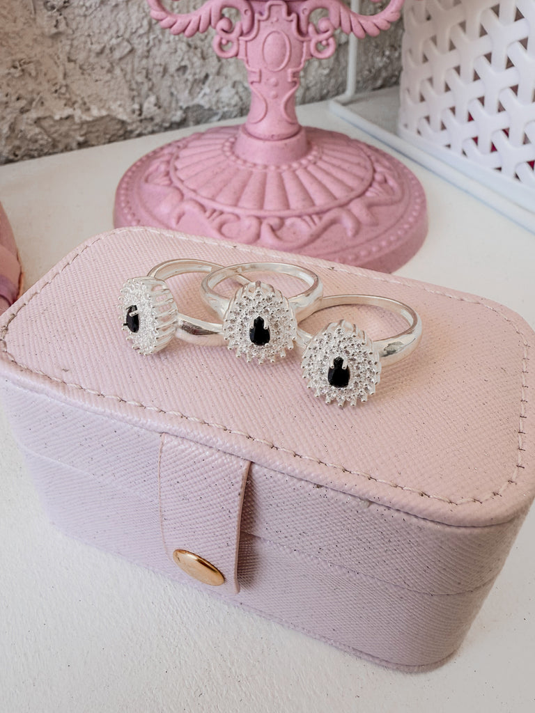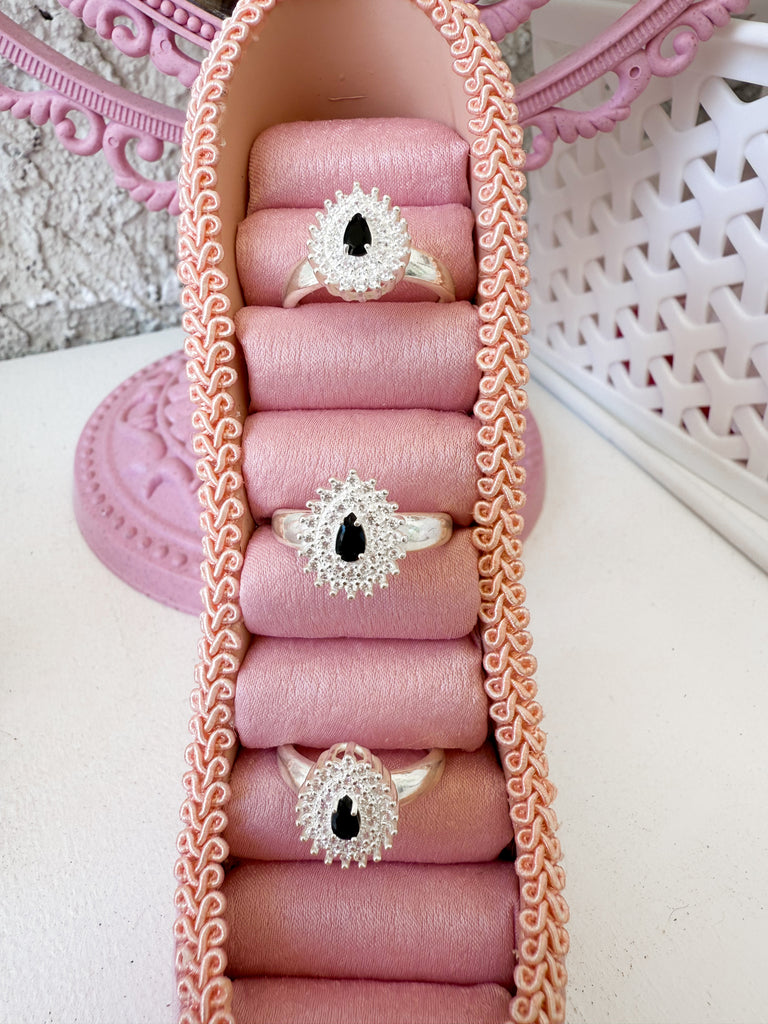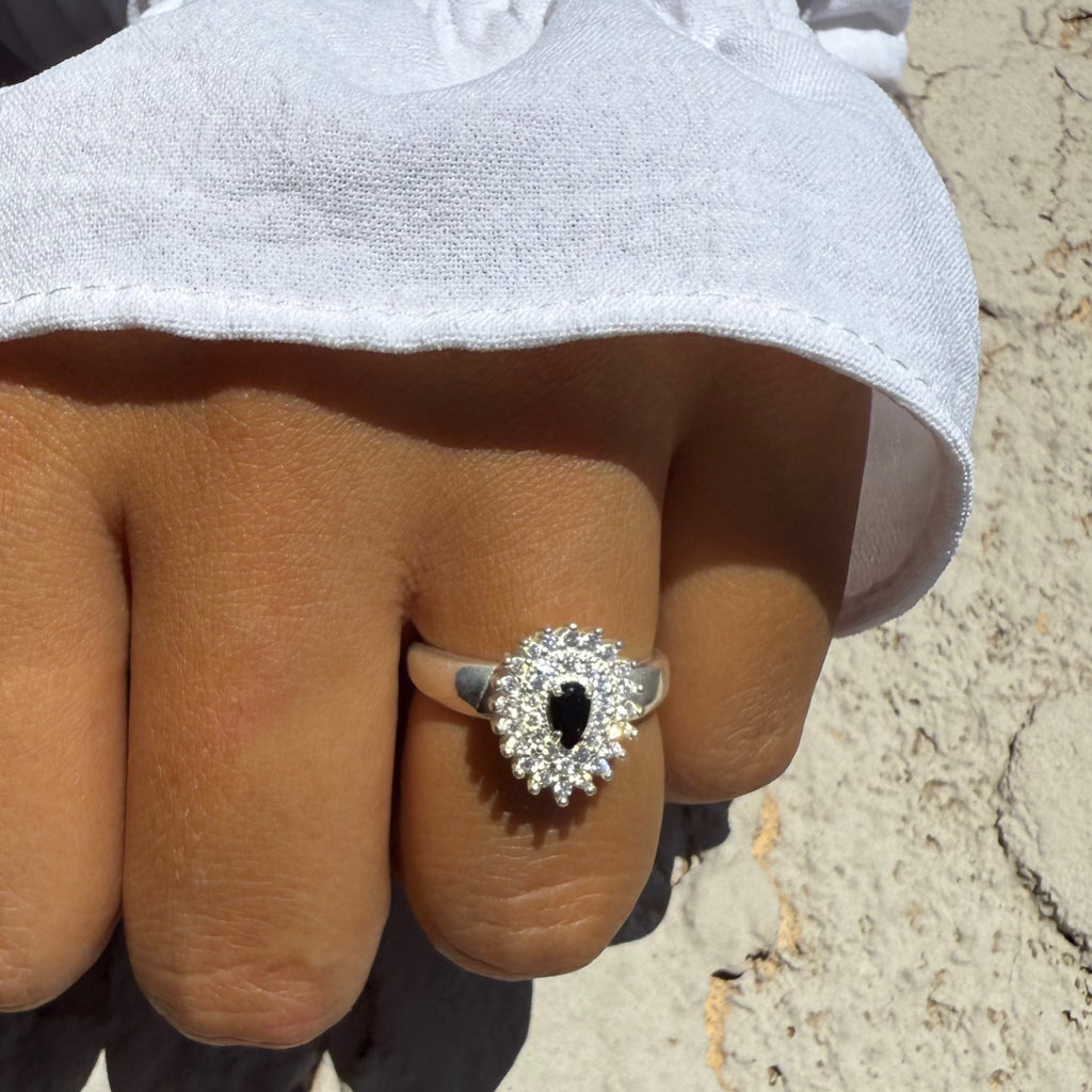 Crafted in 925 sterling silver, this ring features a stunning black teardrop-shaped stone π€, surrounded by sparkling micro zirconias π«. A timeless piece perfect for special occasions or adding elegance to your everyday look.