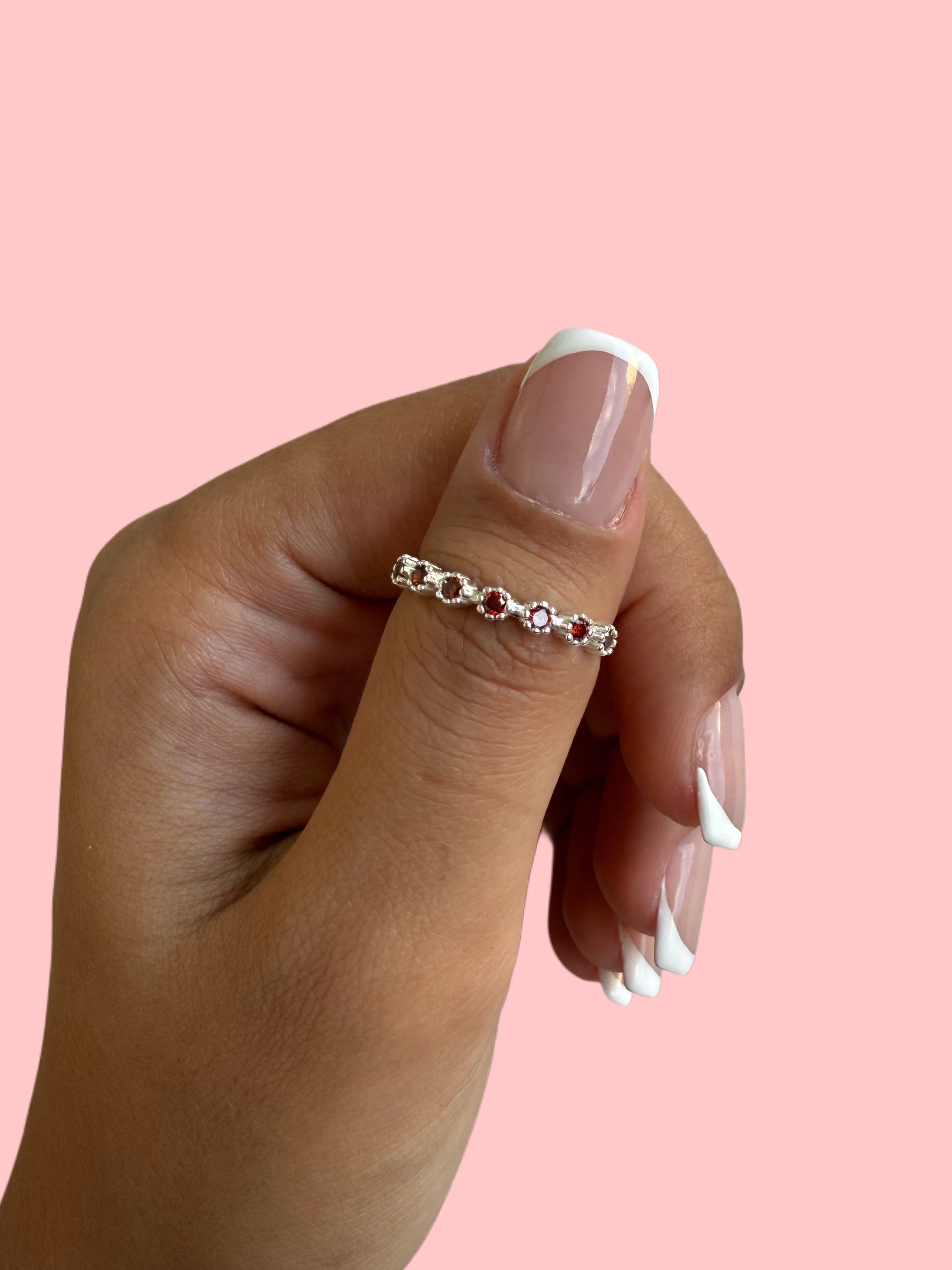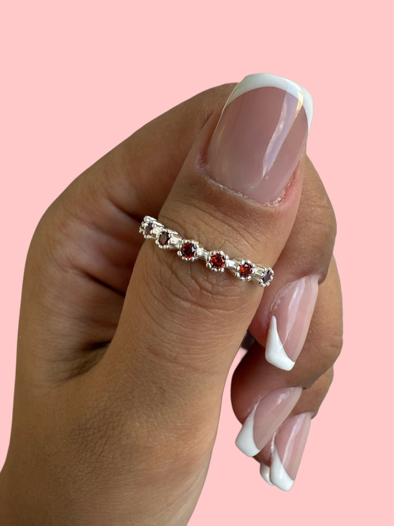 Bold and elegant, this ring features shimmering red zirconias set in a detailed 925 sterling silver band. Perfect to wear alone or stack with your favorites. Fixed size, hypoallergenic, and water-resistant.