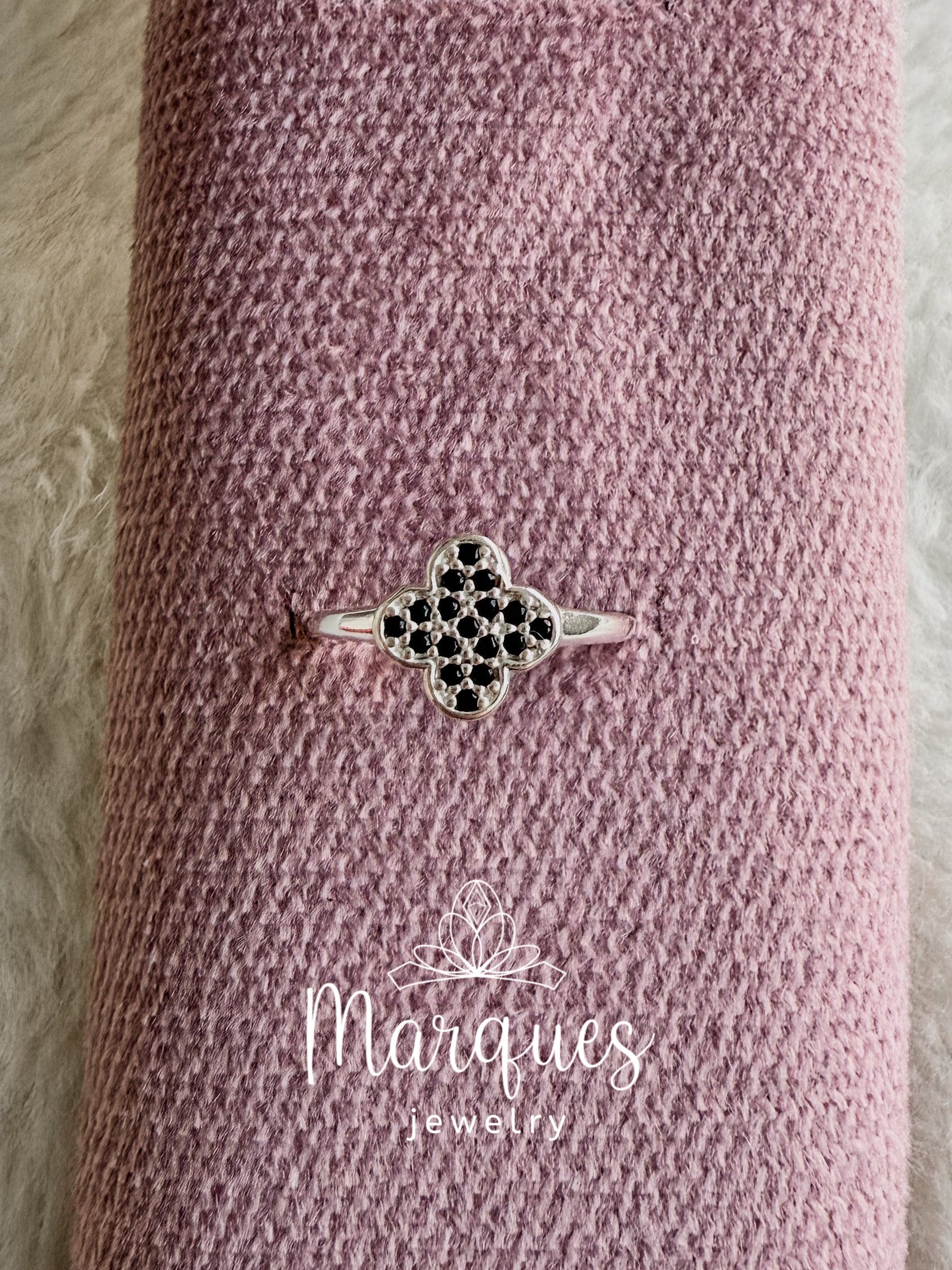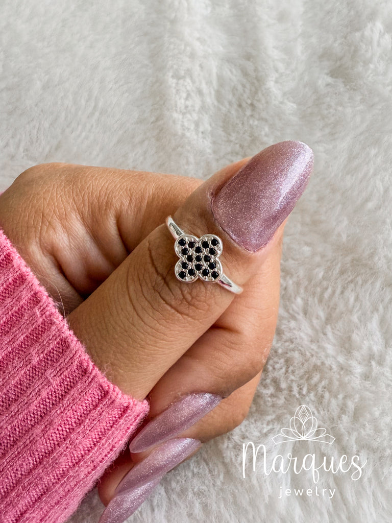 Elegance with a bold touch! This adjustable 925 sterling silver ring features a four-leaf clover design adorned with black cubic zirconia — a symbol of style, strength, and protection.